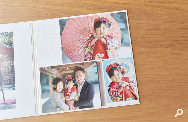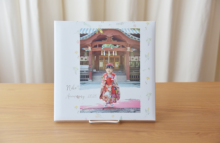 お一人のカットからファミリーフォト、お着物や普段着までいろいろなお姿が残せる写真集プランです。赤ちゃんの小さな手や足、ランドセルから勲章までいろいろな形の記念の写真まで写真集に入れる事が出来ます。またオプションで表紙も写真に変更する事ができます。(+5000円)